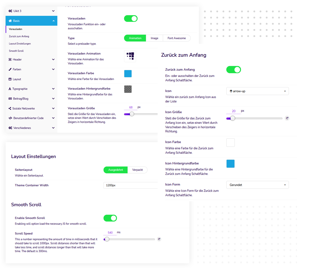Wenn Sie Smooth Scroll aktivieren, wird die Datei Smooth-Scroll.js geladen, die ermöglicht es sog. Onepage Designs zu erstellen.