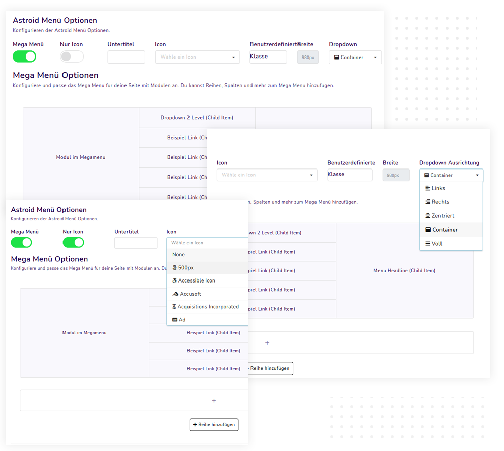 Sobald Sie mit diesen Einstellungen fertig sind, können Sie Ihr eigenes Mega-Menü für einzelne Menüpunkte erstellen. Die Struktur der Menüelemente der Hauptebene entspricht der Struktur Ihres Joomla-Menüs. Standardmäßig werden alle Untermenüelemente automatisch als Dropdown-Menüelemente angezeigt.